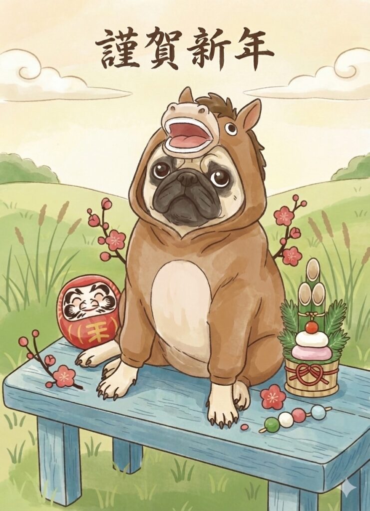ところで今回の画像ですが、当スクール営業担当の看板犬さくらをモデルにchatGPTで作ったものになります。さくらの画像を読み込ませて「年賀状風のイラストにして。着ぐるみを着せて。」など指示をして作ったものです(^^)